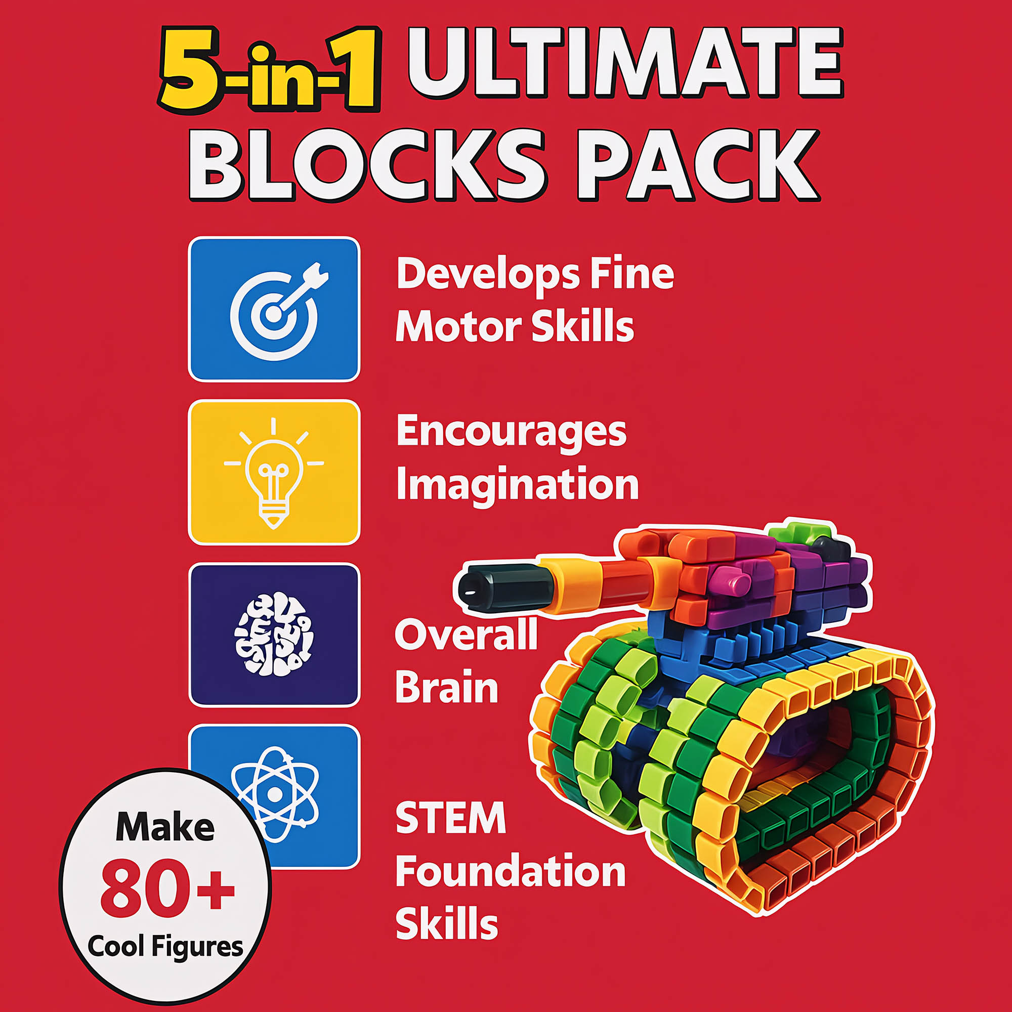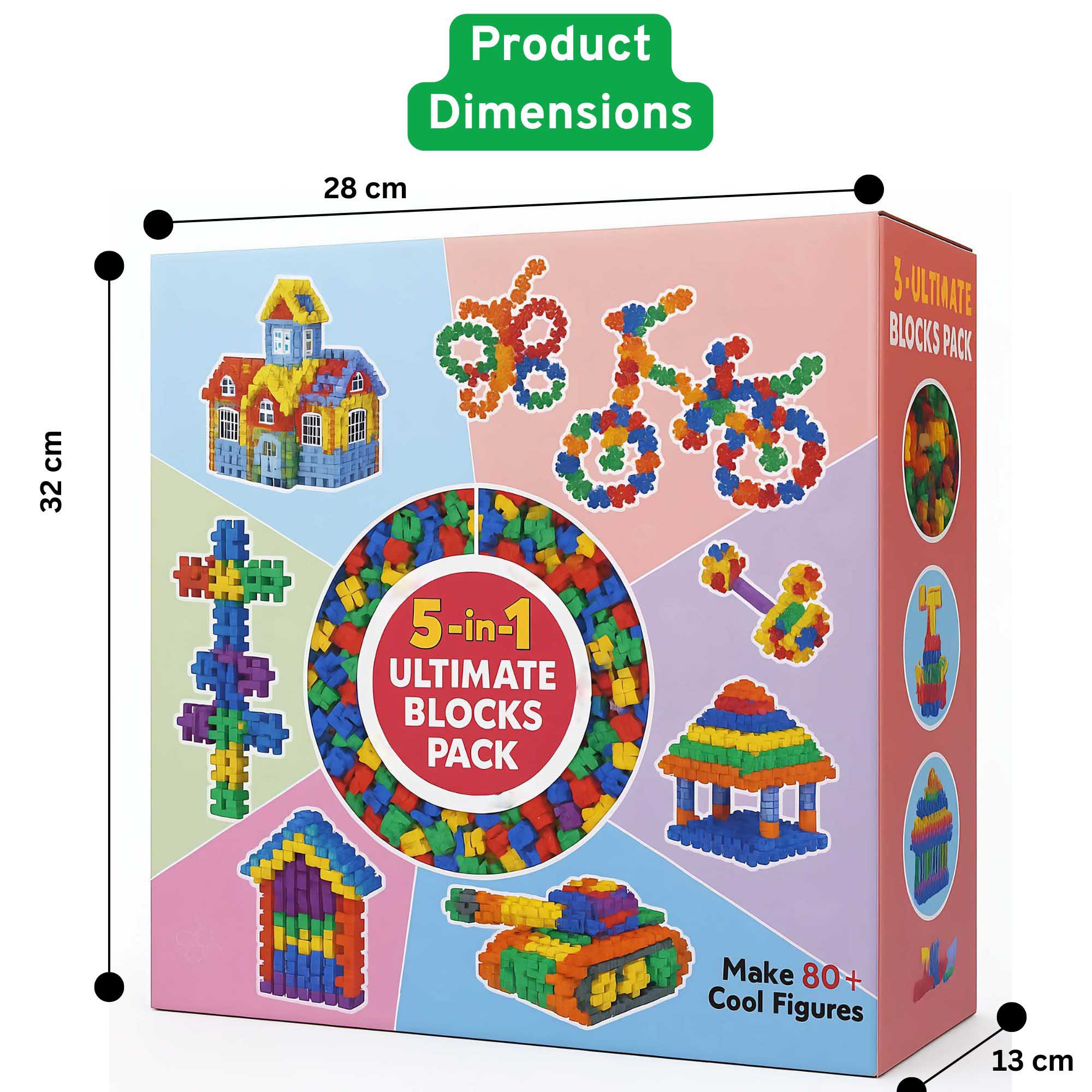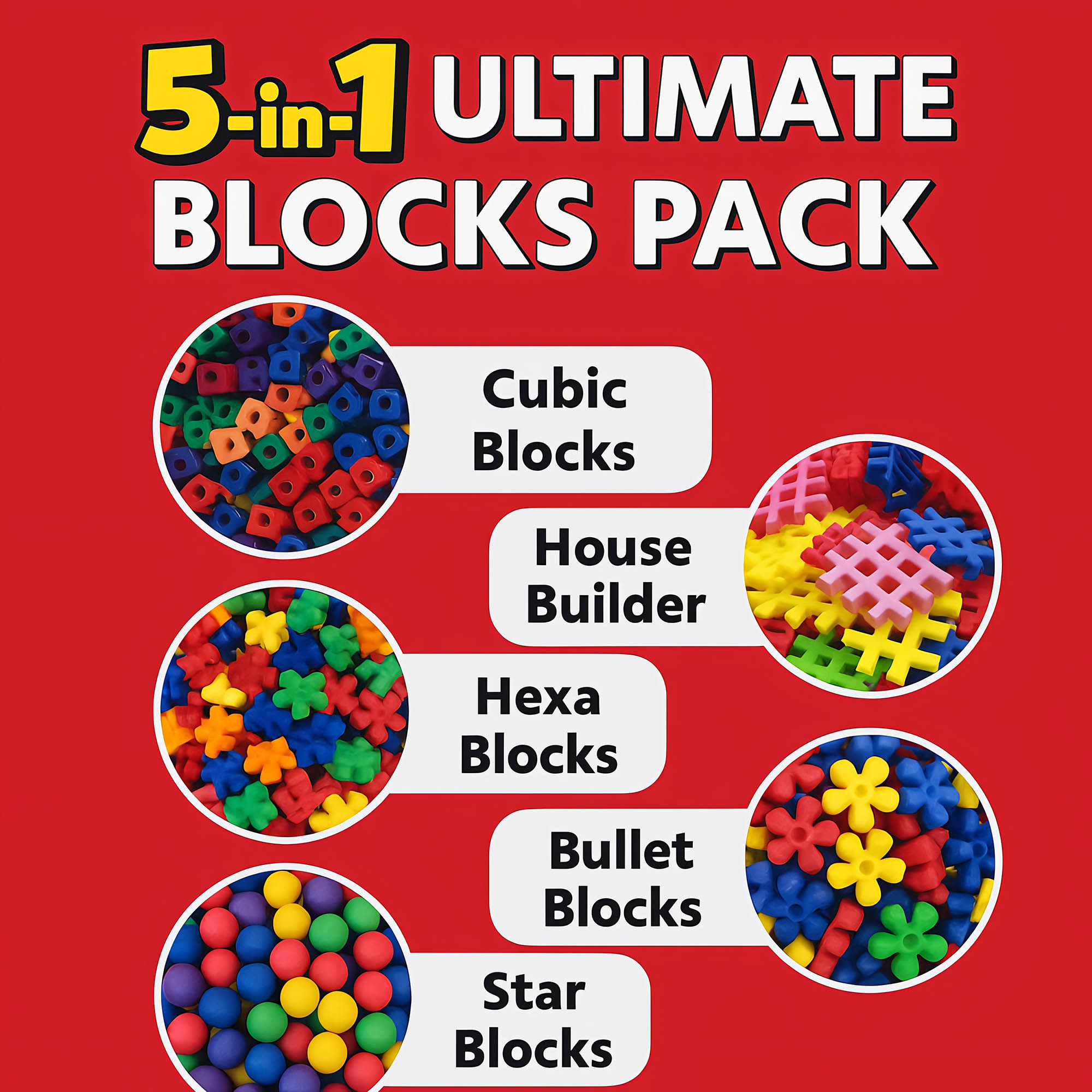 • 5-in-1 Blocks for Kids: Introducing for the first time kids blocks toy set that combines the best of 5 different block types – star blocks, bullet blocks, cubic blocls, hexa blocks and house builder blocks. This blocks for kids 2+ years provides endless possibilities for constructing 80+ unique structures, fostering creativity, and promoting cognitive development.